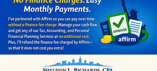 I've partnered with Affirm so you can pay over time without a finance fee charge. Manage your cash flow and get any of our Tax, Accounting, and Personal Financial Planning Services at no additional cost. Plus, I'll refund the finance fee charged by Affirm, so that it does not cost you extra!